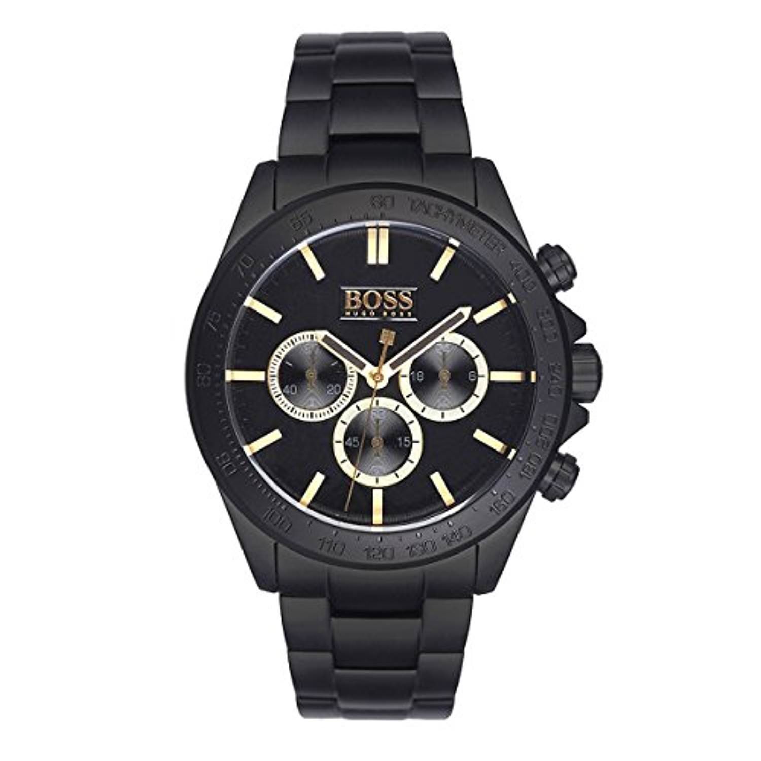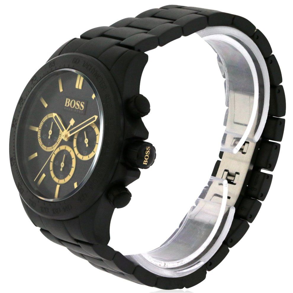 IKON CHRONOGRAPH WATCH: This elegant chronograph watch by BOSS is an integral part of an excellent masculine style. An ideal accessory for traveling abroad, the timepiece features a classic black dial with gold-tone hands and markers. This timepiece is water-resistant to 100 meters. Hugo Boss Ikon 1513278 is a functional and very impressive Gents watch. The case is made out of Black Ion-plated Steel and the Black dial gives the watch that unique look. The features of the watch include (among others) a chronograph. 100 meters water resistance will protect the watch and allows it to get submerged in the water for everyday usage including swimming, but not high impact water sports. We ship it with an original box and a guarantee from the manufacturer.