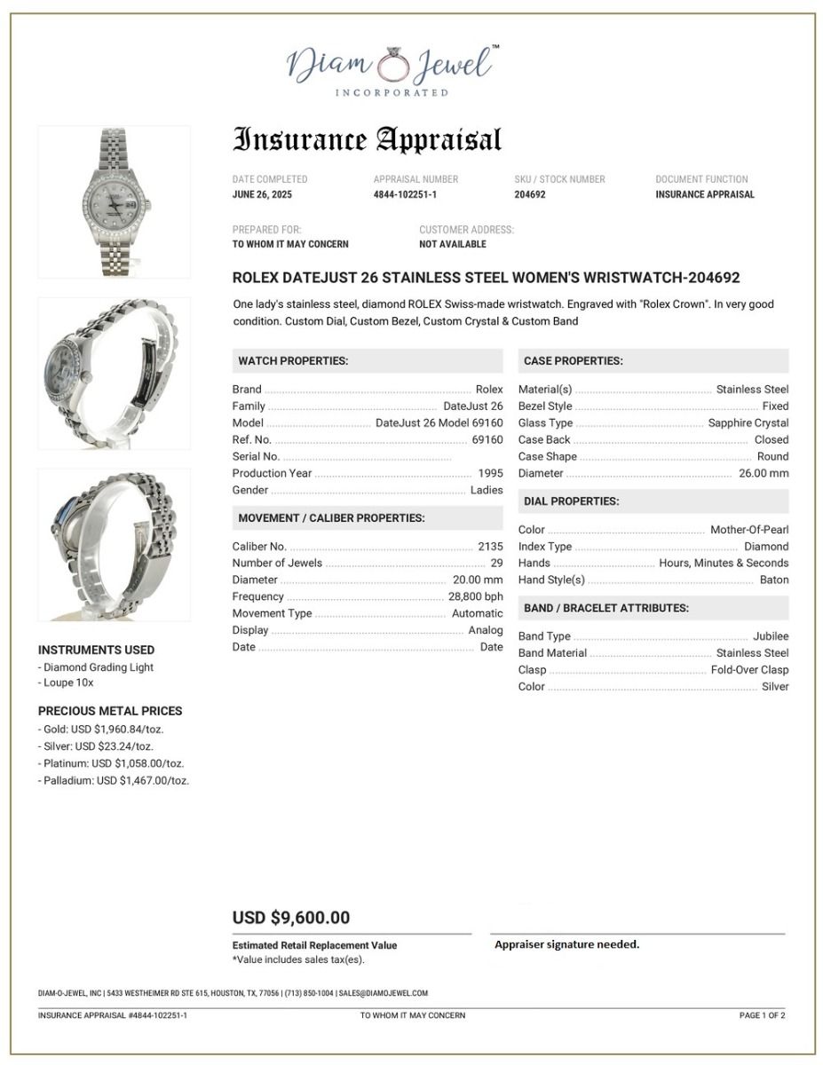 Rolex Date Just 26 Stainless-steel 69160 Mother-of-Pearl Dial Women 26-mm Automatic-self-wind Sapphire crystal. Swiss Made Wristwatch