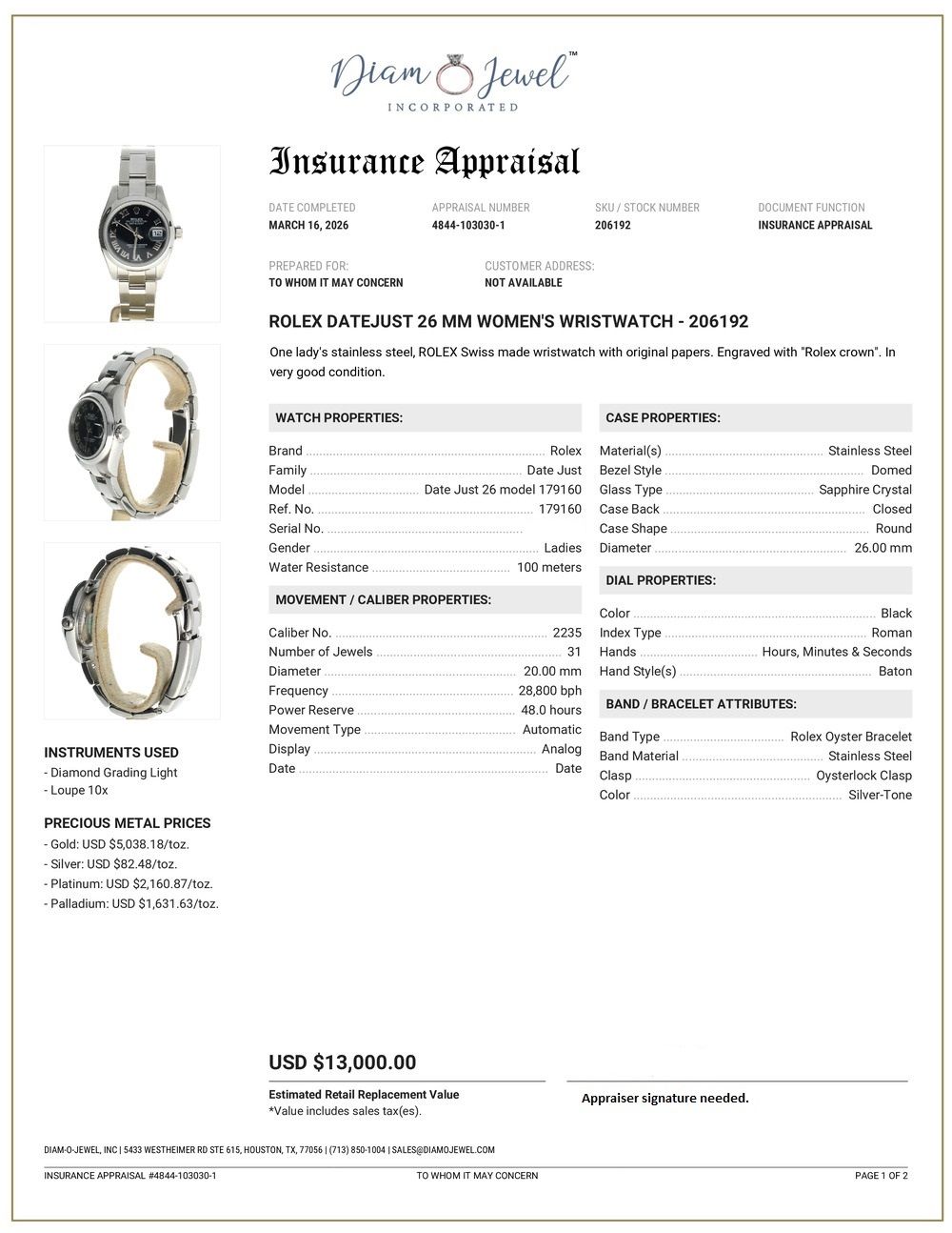 Rolex DateJust 26 Stainless-steel 179160 Black Dial Womens 26-mm Automatic self-wind Sapphire crystal. Swiss Made Wrist Watch