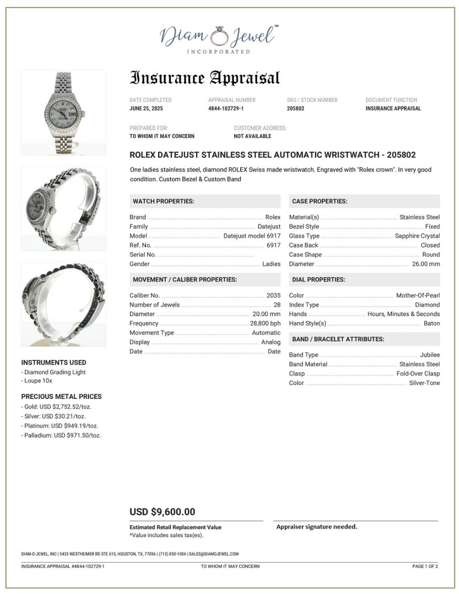Rolex DateJust 26 Stainless-steel 6917 Mother-of-Pearl Dial Women's 26-mm Automatic self-wind Sapphire crystal. Swiss Made Wrist Watch