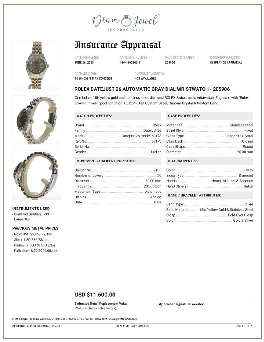 Rolex DateJust 26 Stainless-steel 69173 Grey Dial Womens 26-mm Automatic self-wind Sapphire crystal. Swiss Made Wrist Watch