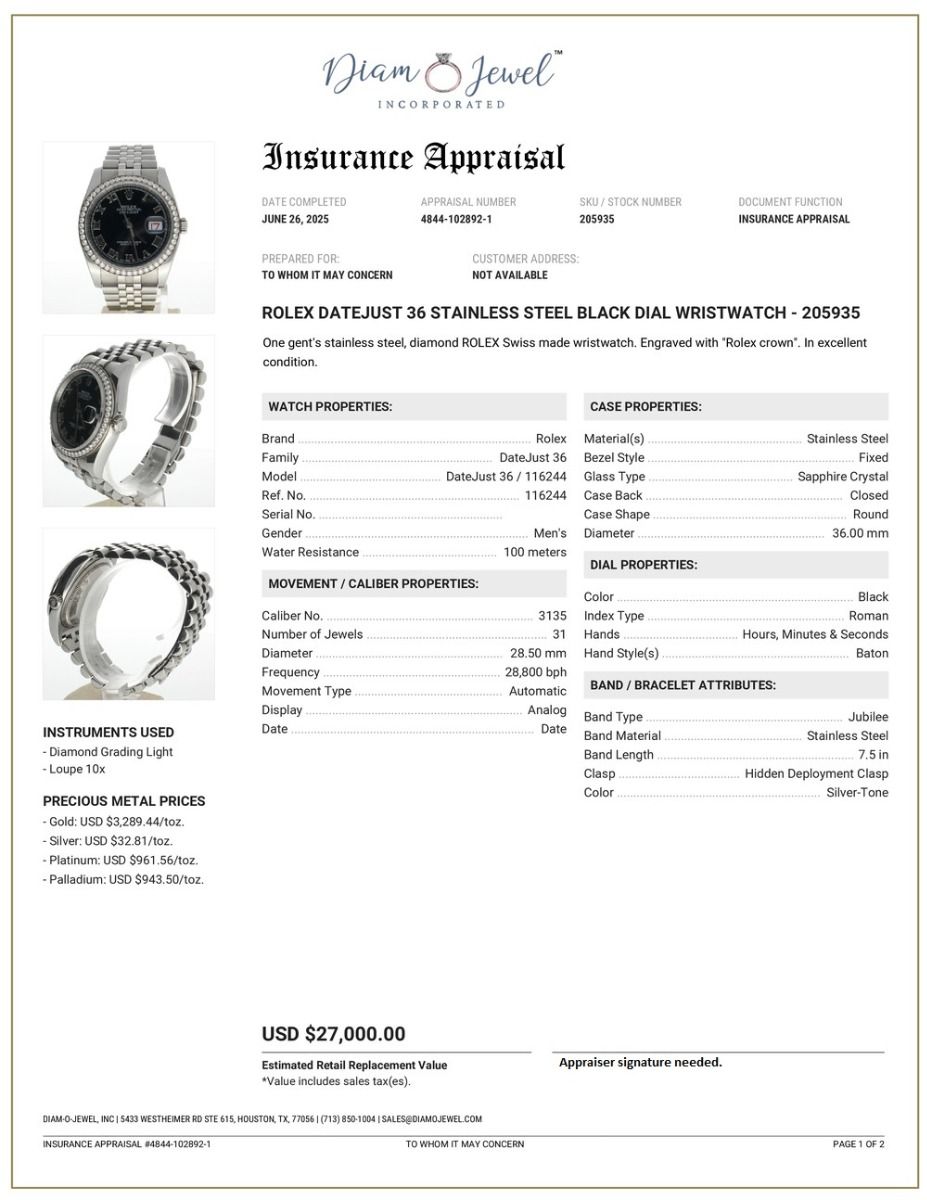 Rolex DateJust 36 Stainless-steel 116244 Black Dial Mens 36-mm Automatic self-wind Sapphire crystal. Swiss Made Wrist Watch