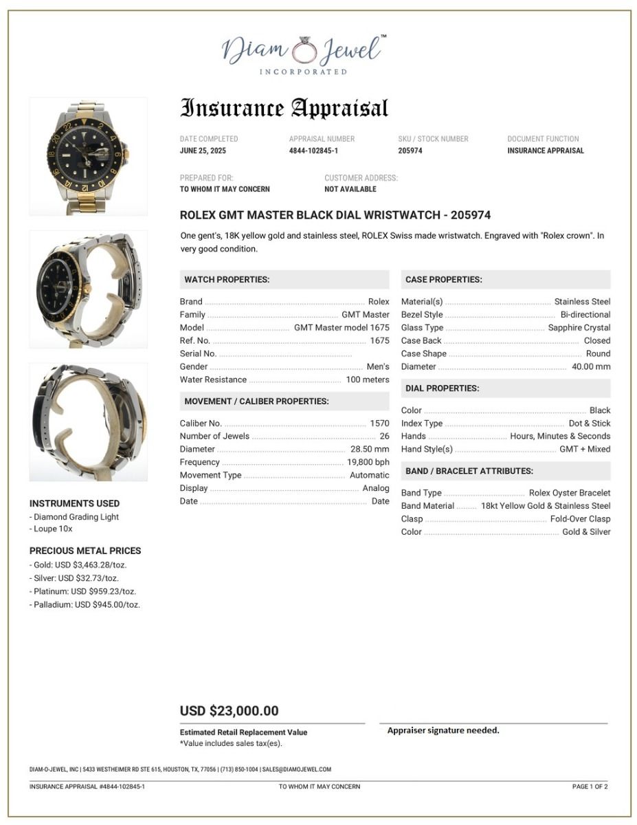 Rolex GMT-Master Stainless-steel 1675 Black Dial Men's 40-mm Automatic self-wind Sapphire crystal. Swiss Made Wristwatch