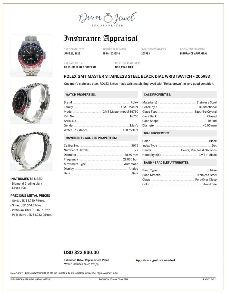 Rolex GMT-Master Stainless-steel 16750 Black Dial Mens 40-mm Automatic-self-wind Sapphire crystal. Swiss Made Wrist Watch